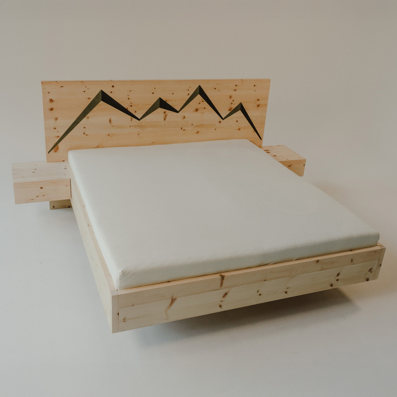 Die Wildspitze in den Ötztaler Alpen ist mit 3770 m der höchste Berg Nordtirols und daher auch passender Namenspatron für diesen besonderen Bettrahmen. Die (optional) eingefrästen Berge, ausgefüllt mit Tiroler Schafschurwolle, in der großen Rückwand zeigen eine ähnlich markante Silhouette. Das Bett ist geradlinig, kantig und doch harmonisch aufgrund der Schwebeoptik. Von zukünftigen und vergangenen Bergtouren träumen – das ist in diesem Bett gewiss.